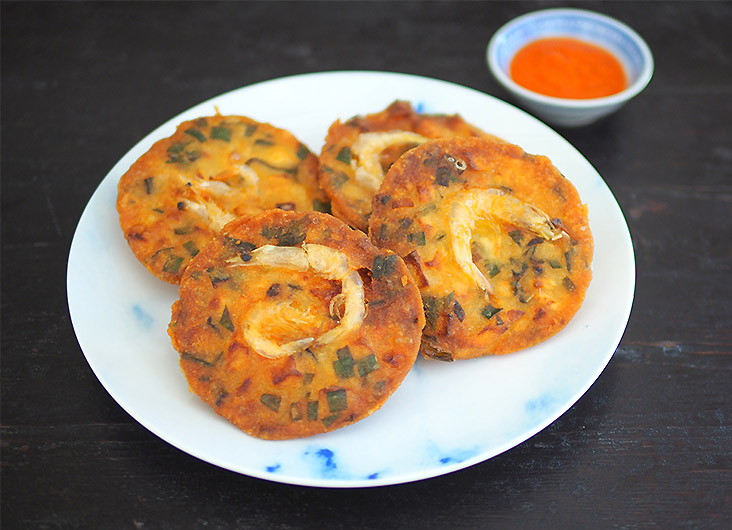 This is essentially Chinese-style prawn fritters. It's totally unlike the Malay version that is tinged yellow from turmeric and has a much softer texture.