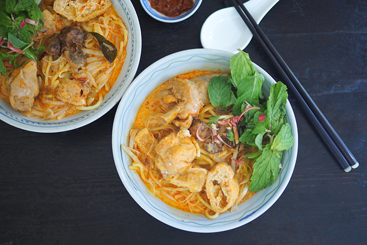 You have the Penang-style curry mee served with cubed cooked pig's blood. Then there is the KL-style curry mee served with chicken, pork skin and cockles. And finally, there's an all-in-one curry mee that seems to be a marriage between both styles.