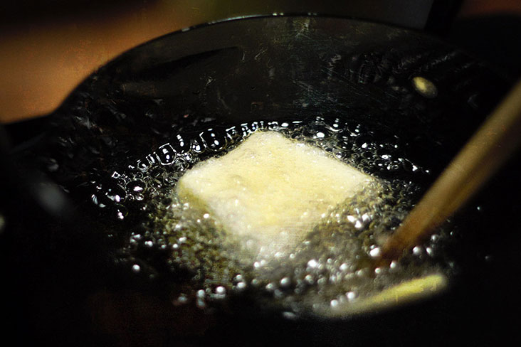 We use it here for agedashi dōfu, not only because it can stand up to the rigours of frying without falling apart but also due to its highly absorbent properties: it’ll take in the flavours of the tentsuyu broth far better than the smoother variety.