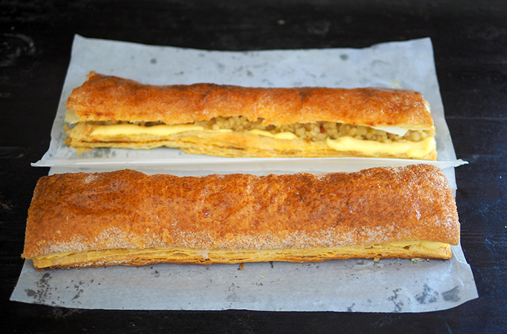 Based on the famous Corica Pastries in Perth, the strudel is constructed with two layers of puff pastry. Sandwiched in between those flaky layers is diced, cooked apples, custard and whipped cream.