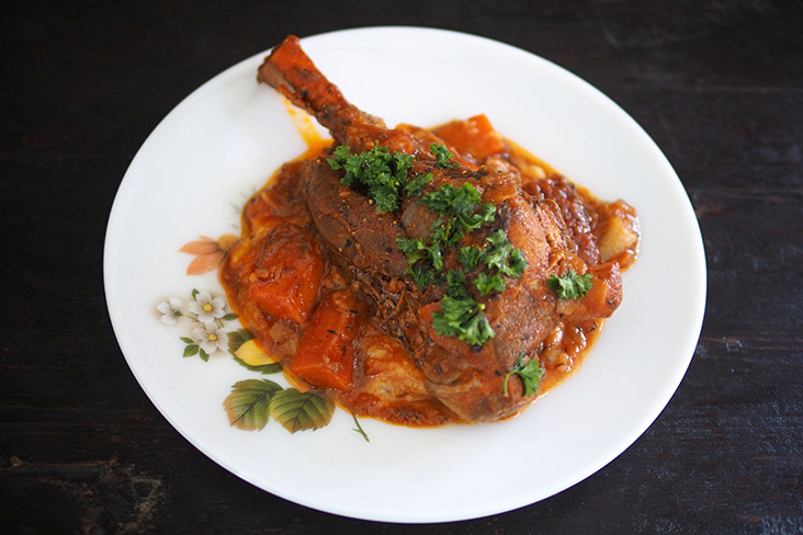 The meat was tender and easily fell off the bone, when pried with a fork and knife. You had mashed potatoes, braised carrots and a tomato based sauce with much depth. This could easily feed a family of four to six people.
