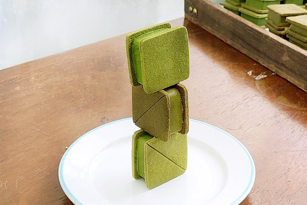 After numerous experiments, they decided to borrow a similar concept from the macarons they had studied, whereby they sandwiched a green tea based filling with square cookies rather round meringue shells.