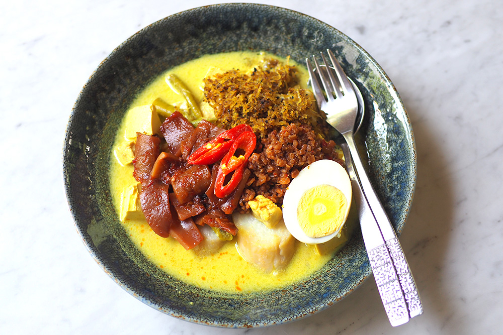 The ayam kicap or chicken cooked in soy sauce has a lighter taste. Nevertheless, the milder flavour matches the whole dish since there are so many elements on the plate. The rendang is delicious too with a rich coconut taste and fork tender meat.
