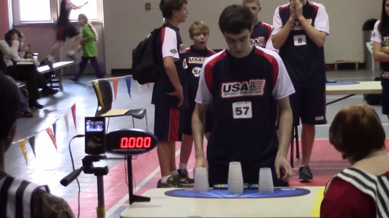 Sport stacking, also known as cup stacking or speed stacking, is a competitive individual and team event where competitors compete in stacking specialised plastic cups. (Who knew that was actually a thing?)