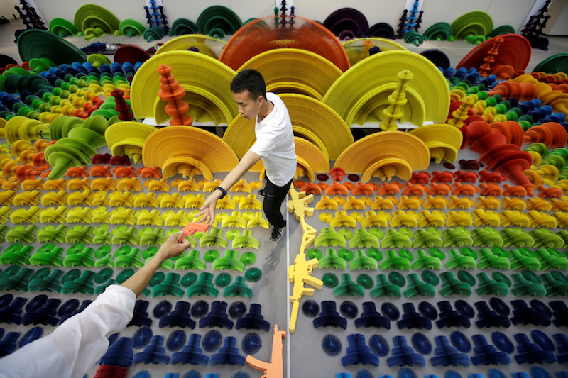 Ocean of Flowers, which opened at the Eight One Art Museum in Beijing yesterday, comprises nearly 2,000 brightly coloured paper sculptures that can be folded up into weapons.