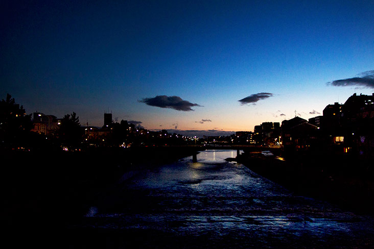 The sun sets, deepening the shadows surrounding the machiya and transforming their distinctive ichimonji roofs into silhouettes. Street lamps light up. From the Gion Shijo station, we cross the Shijo Bridge. The Kamo River flows placidly below us as we walk the span of Shijo-dori, Kyoto’s busy Fourth Avenue.