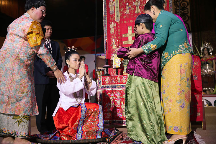 Within the family, they will hold the cheo thau or hair combing ceremonies, where the date is determined by the Chinese almanac. This will be followed by gantang or rice measure ceremony and ki beh to unveil the bride.