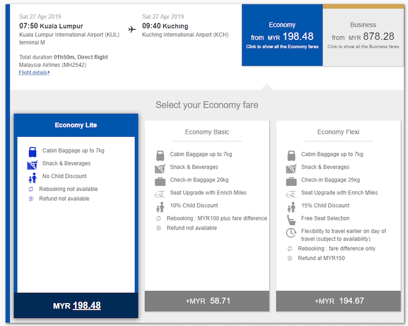 On the lowest “Economy Lite” fare, you still get hand-carry baggage allowance of up to 7kg. In case you’re wondering, the full-service carrier is still providing snacks and beverages on board for the “Economy Lite” fare. The lowest fare also does not allow you to get a child discount and there’s no option to request for a seat upgrade using Enrich Miles.