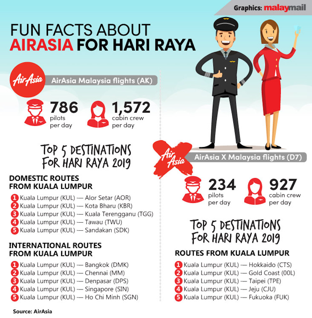 A total of 1,020 pilots and 2,499 cabin crew will be on duty this Hari Raya for both the short-haul and long-haul carrier flights travelling to destinations like Japan, Australia, India, South Korea, Vietnam, Singapore and Taiwan.