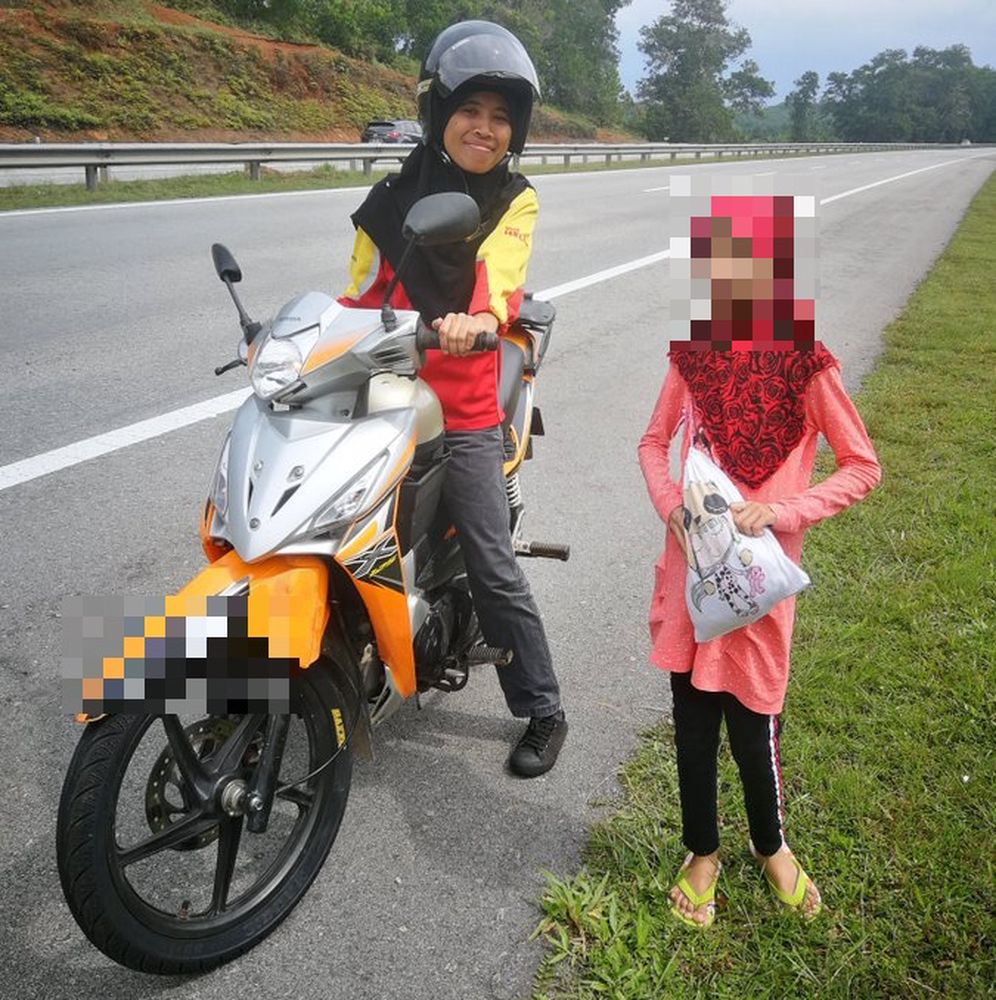 At 3.34pm, @Sutungmenjerit tweeted a photo of her daughter and a worker named Suria from the petrol station on a motorcycle, and said the Shell staff had helped send her daughter back to the awaiting family members.
