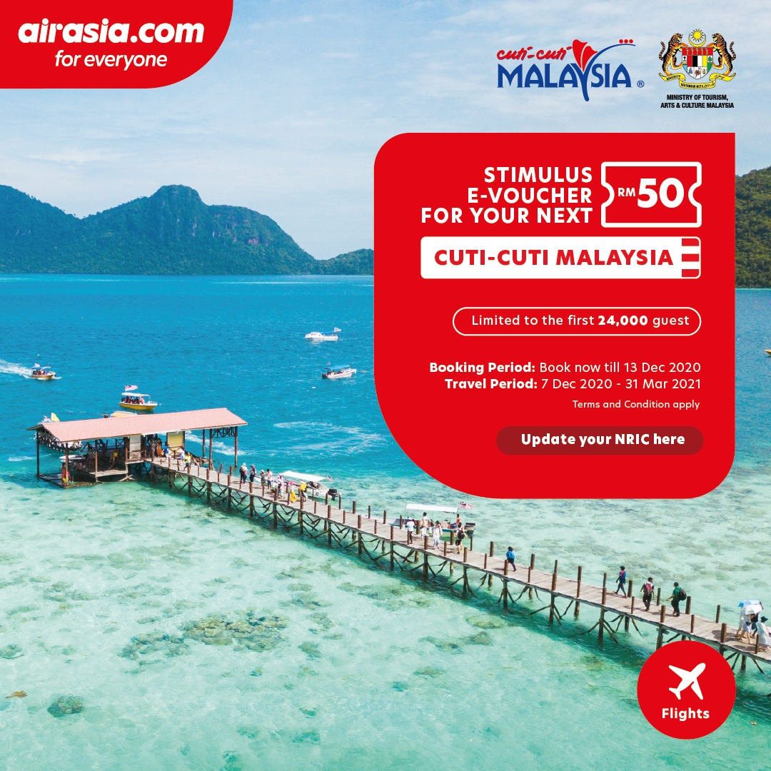 KUALA LUMPUR, Nov 30 — Low-cost carrier, AirAsia, has announced that the RM50 Cuti-Cuti Malaysia eVoucher will be available for redemption starting today.