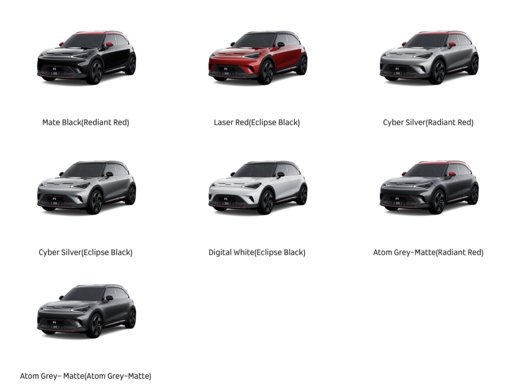 The Smart #1 Brabus comes in seven colour options which has different two-tone colour combination. The Digital White and Laser Red come only with the Eclipse Black roof, while the Meta Black only comes with a Radiant Red roof. Meanwhile, the Atom Grey (Matte) and Cyber Silver come with either Eclipse Black or Radiant Red roof.