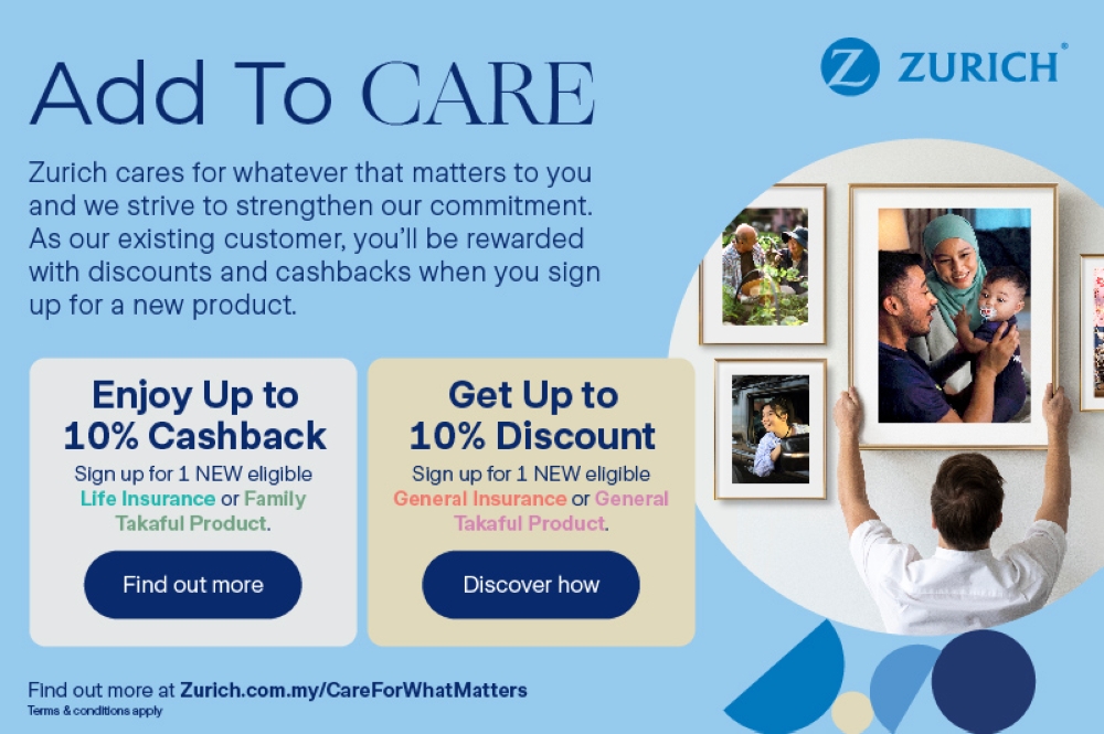 Customers who participate in the Add to Care campaign are entitled to a ten per cent cashback or discounts when they sign up for a new eligible product with Zurich Malaysia.