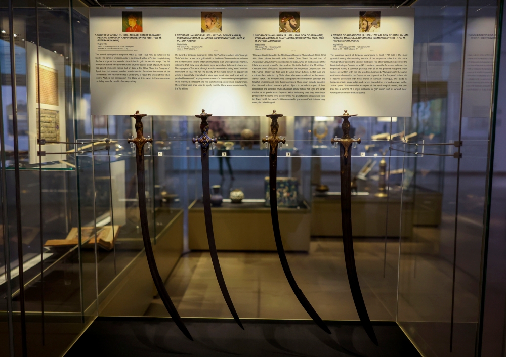 Four royal swords from the Mughal Empire in India, dating from the 15th to the early 18th century, belonging respectively to Emperor Akbar, who reigned from 1556 to 1605, Emperor Jahangir (1605-1627), Emperor Shah Jahan (1628-1666), and Emperor Aurangzeb (1658-1707), are displayed in the exhibition.