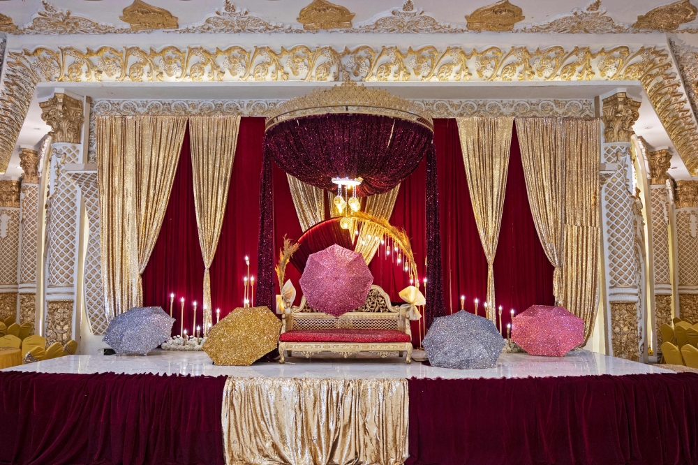 Bunches of plastic flowers, throne-style sofas, gilded trimming and neon lights fill the complex’s four halls, some of which can accommodate up to 7,000 guests.