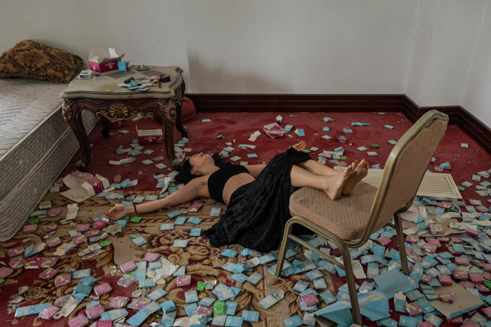 Props from past photoshoots were scattered on the floor and on one ballroom wall, “Long Live Chairman Mao” was written in spray paint.