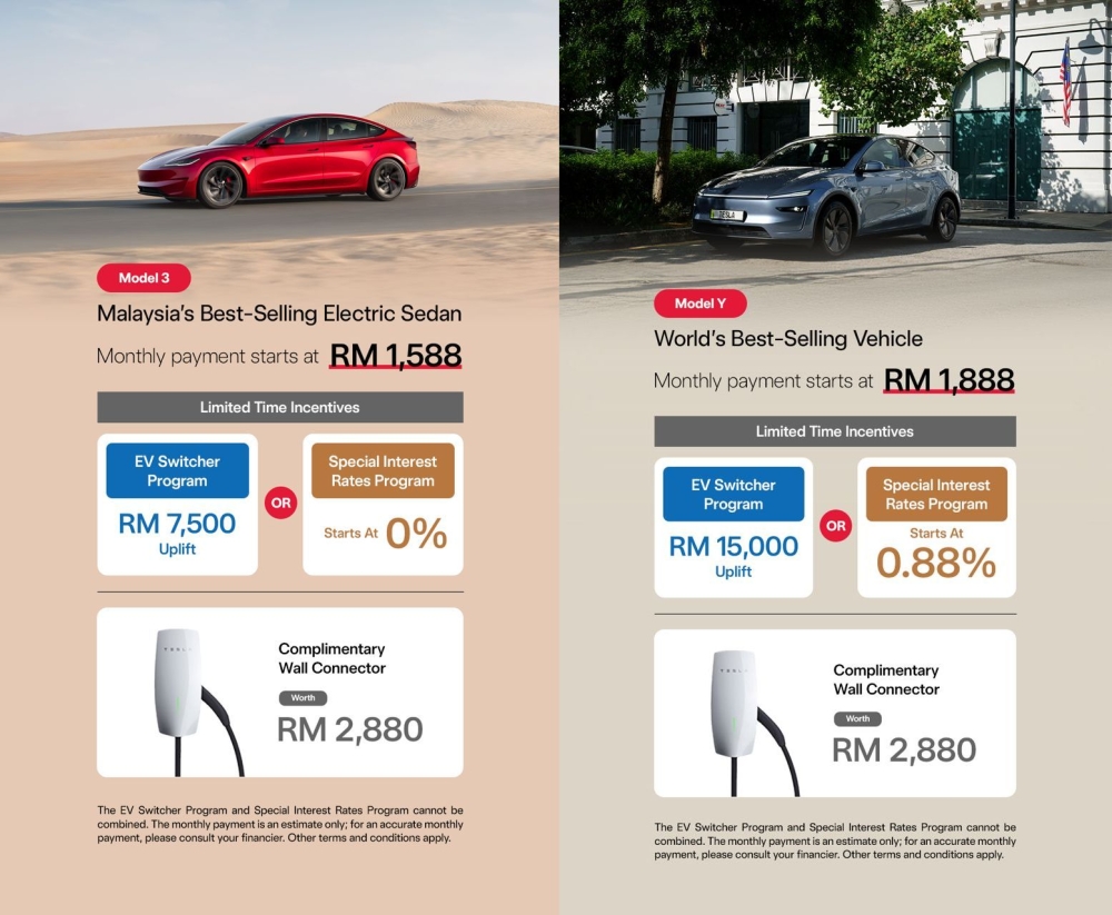 Meanwhile, the Model Y is given a bigger RM15,000 uplift for trade-in or a special interest rate programme that starts at 0.88 per cent.