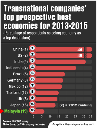 KUALA LUMPUR, June 27 ― Malaysia was rated the 16th best investment destination by the United Nations this year, improving on its 19th place from 2012 and drawing level with France and Canada