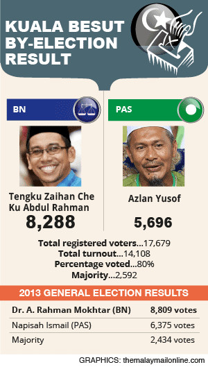 At curtain call, BN candidate Tengku Zaihan Che Ku Abdul Rahman emerged the winner in the closely-watched election, edging out PAS’s Azlan Yusof with a 2,592-vote majority, polling 8,288 votes to his contender’s 5,696 votes.