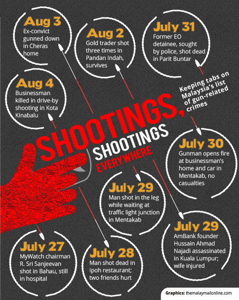 Shootings and gun murders exploded into the nation’s consciousness last Monday when Arab-Malaysian Development Bank founder Hussain Ahmad Najadi was assassinated in broad daylight by a gunman in Kuala Lumpur, just days after Sanjeevan survived an attempted hit in Negri Sembilan on July 27.