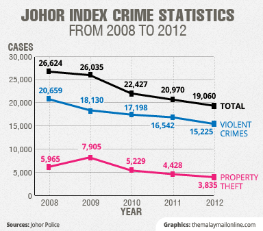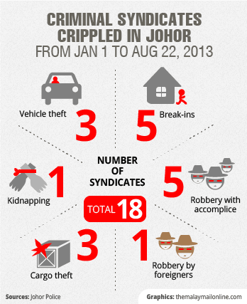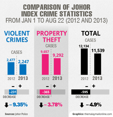 In the same period this year, the police also successfully crippled 18 criminal syndicates, including those linked to robberies, house break-ins and vehicle theft.In the five-year period between 2008 and 2012, the state’s crime rate dropped from 26,624 cases in 2008 to 19,060 in 2012, which translates to a decline of 7,564 cases or 28 per cent.