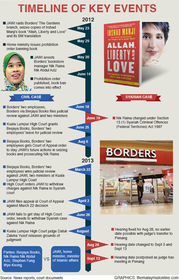 On March 22 this year, the Kuala Lumpur High Court ruled that JAWI had acted illegally in raiding Borders and seizing the books, as well as charging Nik Raina.