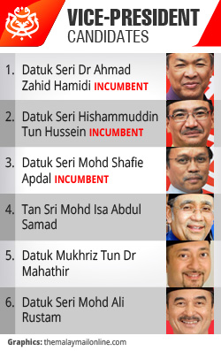 Zahid is one of three incumbent vice-presidents, together with Datuk Seri Shafie Apdal and Datuk Seri Hishammuddin Hussein — all Cabinet ministers.