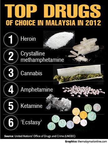 The top three drugs favoured by Malaysians last year were heroin, crystal meth and cannabis.
