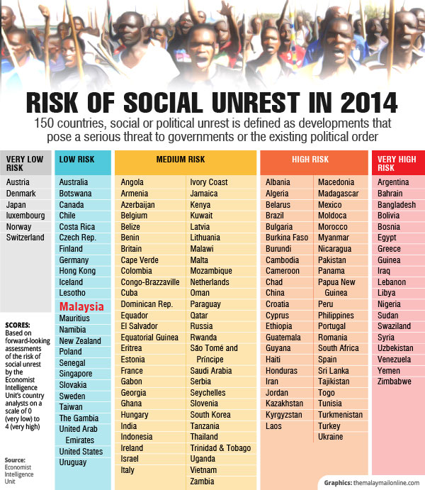 In the original report, Malaysia was among 22 countries such as Australia, Canada, Singapore and the United States that faced little risk of unrest in 2014.
