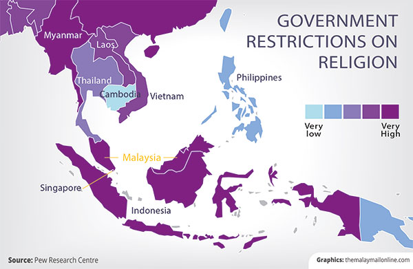 KUALA LUMPUR, Jan 15 – Malaysia’s government sets “very high” restrictions on religion that are on par with Iran, Saudi Arabia, Sudan and Afghanistan, according to a report by Washington-based research organisation, Pew Research Centre.