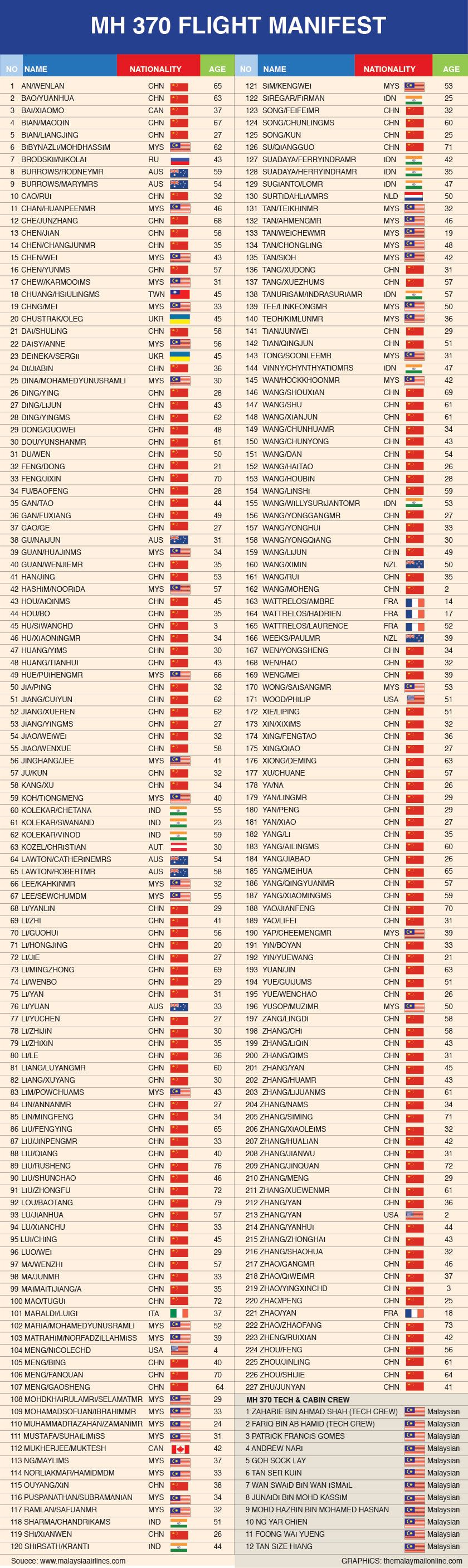 KUALA LUMPUR, March 9 ― Malaysia Airlines (MAS) yesterday has released an official manifest of the 229 passengers and crew aboard flight MH 370 that went missing en route from Kuala Lumpur International Airport to Beijing, China.