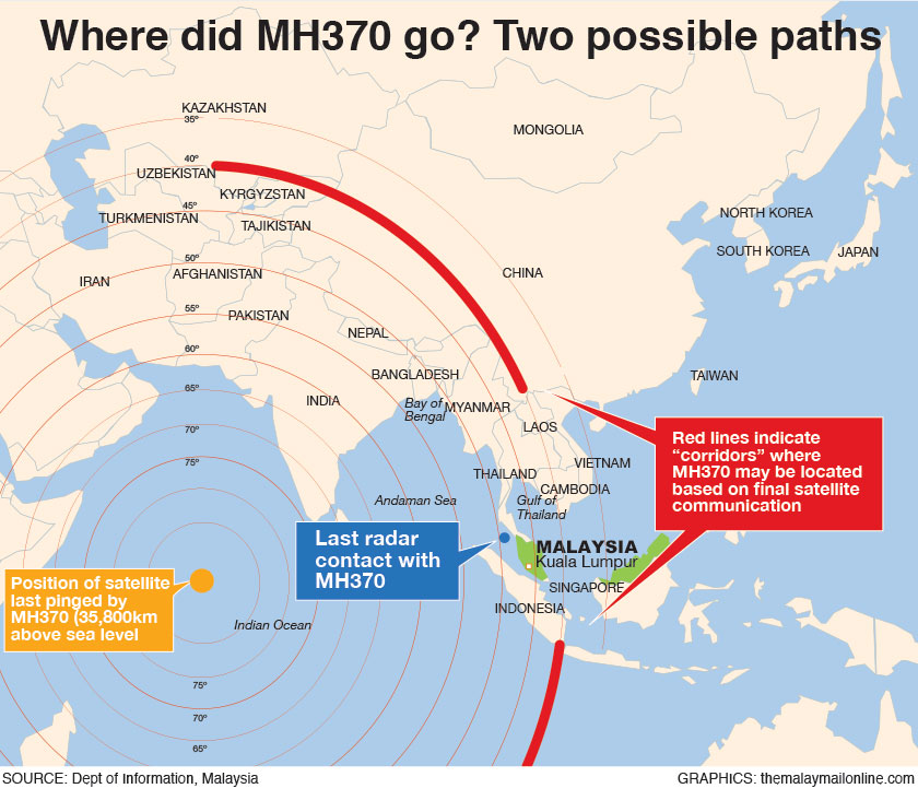 “Based on this new data, the aviation authorities of Malaysia and their international counterparts have determined that the plane’s last communication with the satellite was in one of two possible corridors,” Najib said at a press conference at the Sama-Sama Hotel here today.
