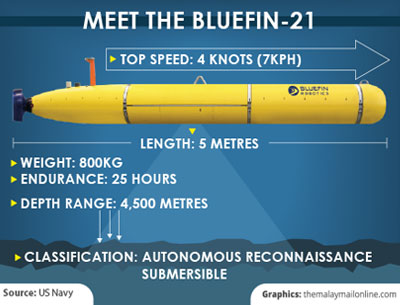 Standing by to take over as soon as the search area is narrowed sufficiently is an American underwater robot called Bluefin-21.