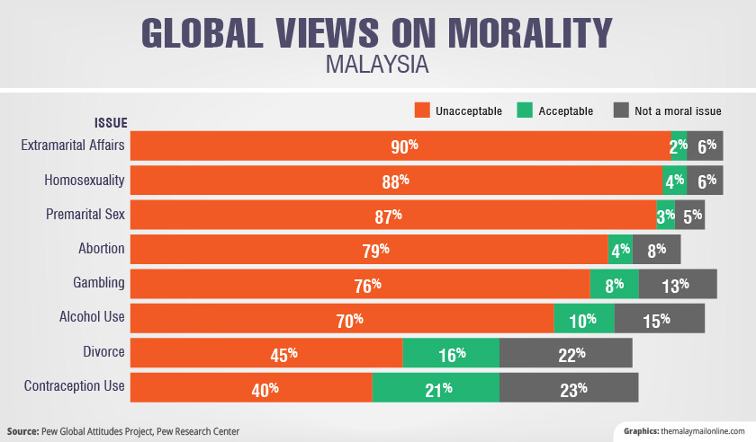 In the Washington-based research group’s Global Views on Morality survey released this week, Malaysia was among the ten countries most opposed to contraceptives, alcohol, extramarital affairs, homosexuality and abortion.