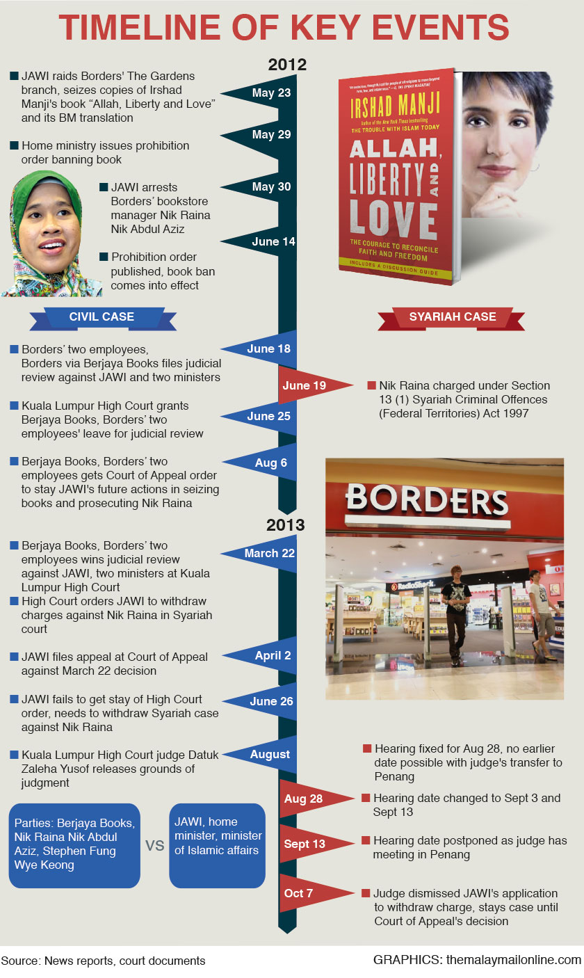 In a high profile case, the Federal Territory Islamic Affairs Department (JAWI) prematurely raided a branch of Borders bookstore in May 2012 for Irshad Manji’s “Allah, Liberty and Love”, a book banned by the Home Ministry three weeks later.