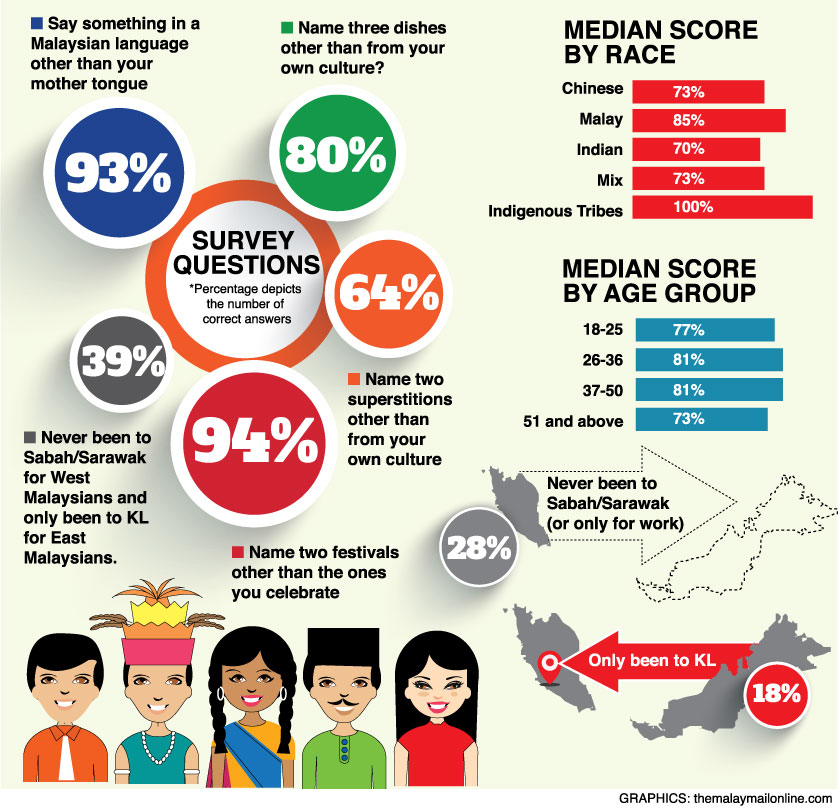 The survey, which polled about 61 Malaysians across Malaysia, tested their knowledge of other ethnic groups in five areas: language, cuisine, superstitions, festivals, and if they have been to East Malaysia (for those from the peninsula) or West Malaysia (for those from Sabah or Sarawak).