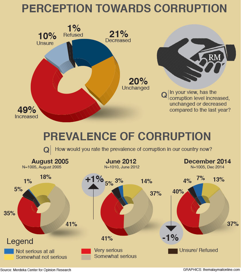 KUALA LUMPUR, Dec 10 — A local survey has found that public perception towards corruption in Malaysia has remained unchanged since 2005, with 77 per cent of Malaysian voters saying it is either “very serious” or “somewhat serious”.