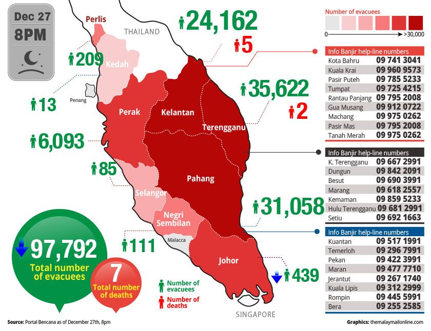 As at 5pm, Terengganu recorded the highest number of evacuees with 35,622, Pahang 31,058, Kelantan 24,162, Perak 6,093, Johor 1,096, Perlis 209, Negri Sembilan 111, Selangor 85 and Kedah 13.