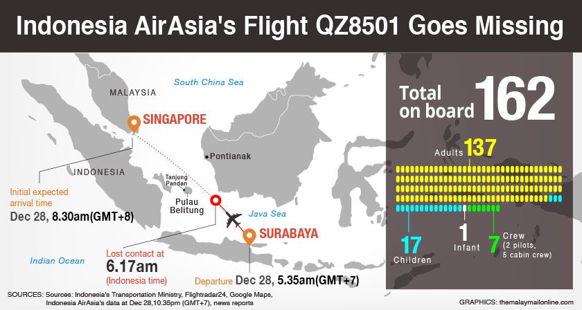 JAKARTA, Dec 28 — An Indonesia AirAsia flight QZ8501 went missing today about half way between its origin of Surabaya in Indonesia and its destination of Singapore, an Indonesian transport official said.
