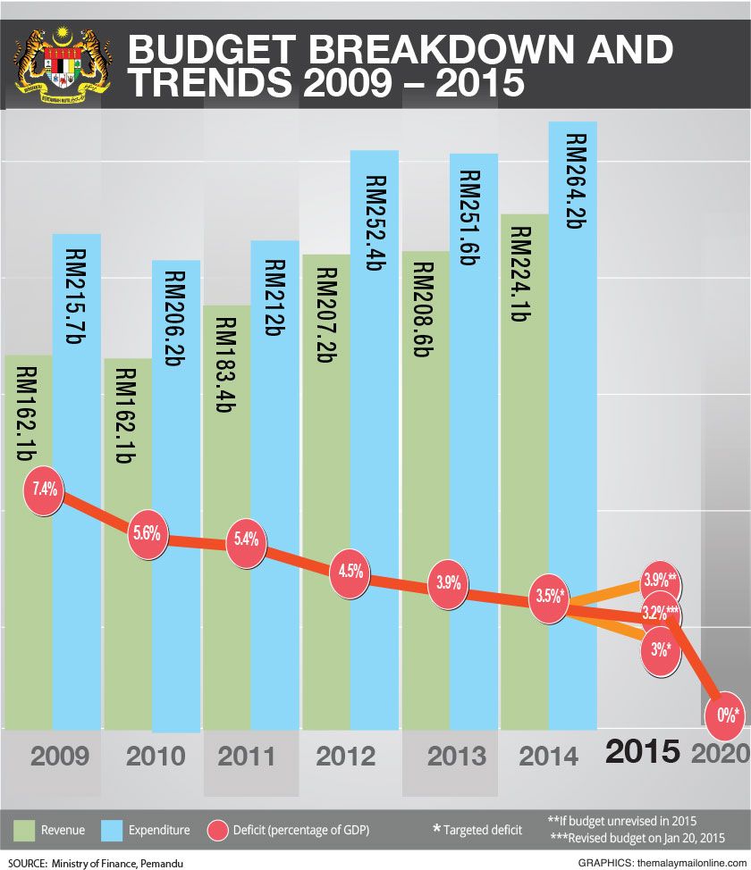 Najib said during his announcement Tuesday that the Budget for 2015 that was announced when crude oil prices were hovering above US$110 per barrel was no longer realistic as oil price has fallen below US$50 per barrel.