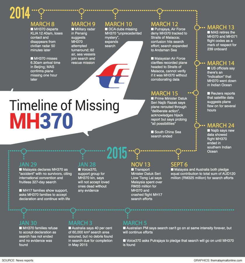 -- Grieving relatives mark one year since MH370 disappeared. Malaysia Airlines holds a private ceremony for staff and the families of the flight crew at its headquarters, while an association of MH370 families organises a separate public event in Kuala Lumpur.