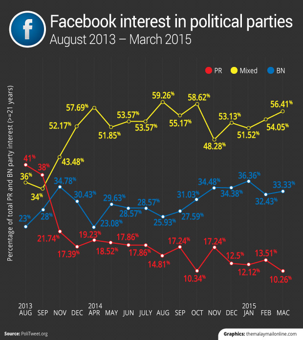 In comparison to PR, interest in BN on Facebook has risen from 23 per cent in August 2013 to around 33.33 per cent in March this year.