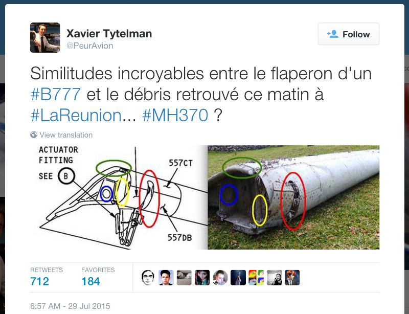 French aviation expert Xavier Tytelman was the first to point out the similarities between the debris and a flaperon.