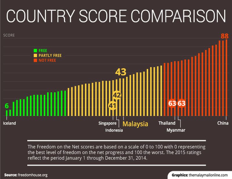 According to the Freedom on the Net 2015 report by US-based NGO Freedom House released this week, Malaysia scored 43 out of 100, with 100 indicating the least free, worse than 2014’s 42 score, while Singapore scored slightly better than Malaysia this year at 41.