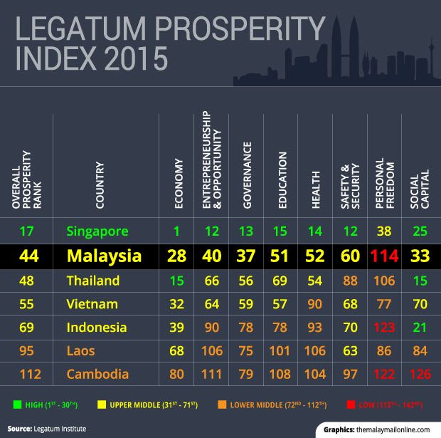 Malaysia has been hovering between the 43rd and 45th ranks in the Legatum Prosperity Index since 2009.