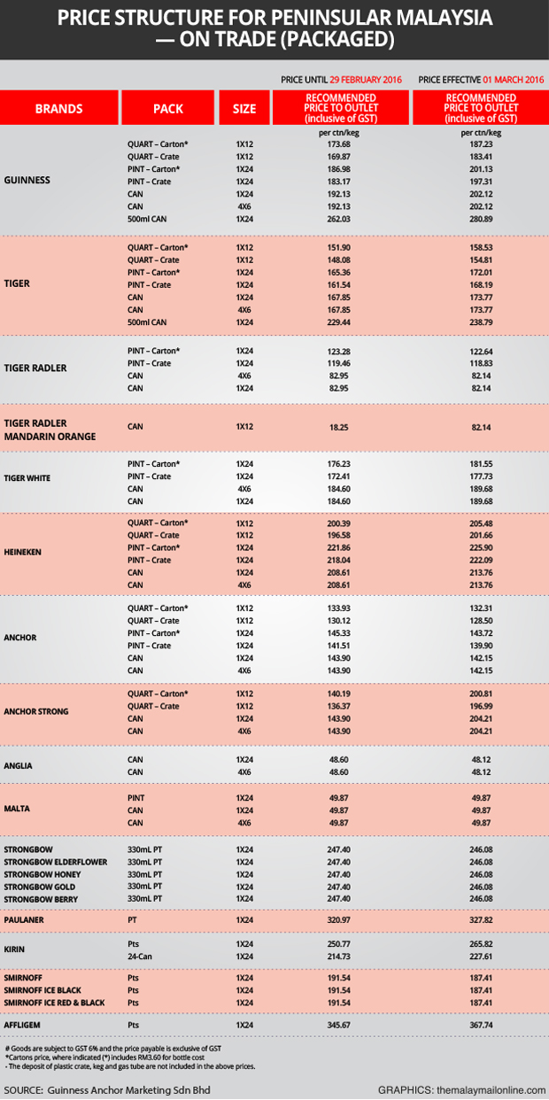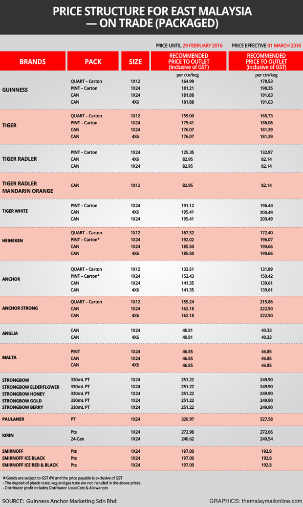 Price differences on the peninsula were similar, with a can of Guinness going from RM8.00 to RM8.42, Tiger from RM6.90 to RM7.20 and Heineken from RM8.70 to RM8.90.