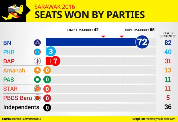 KUCHING, May 8 — Barisan Nasional (BN) garnered 63.72 per cent of the popular vote in the 11th Sarawak State Election.