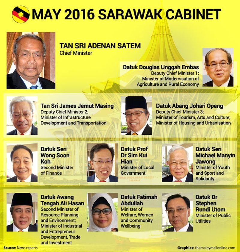 KUCHING, May 13 — Sarawak Chief Minister Tan Sri Adenan Satem announced today his 10-member state Cabinet, naming himself also as finance minister and minister of resource planning and environment.