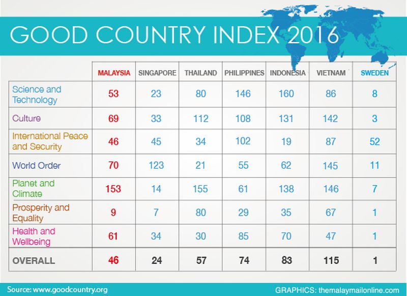 KUALA LUMPUR, June 3 — Malaysia came in 46th in the Good Country Index measuring nations' contributions to the world's well-being, behind only neighbour Singapore in the region.
