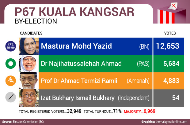 Meanwhile in KUALA KANGSAR, Datin Mastura Yazid won the seat previously held by her late husband Datuk Wan Mohammad Khair-il Anuar Wan Ahmad with a majority of 6,969 over PAS candidate Dr Najihatussalehah Ahmad followed by Amanah’s Prof Dr Ahmad Termizi Ramli.